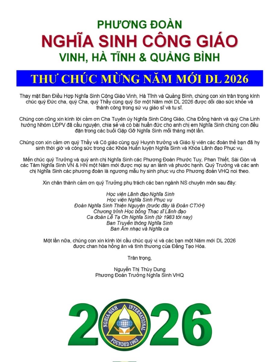 🙏 Thay mặt Ban Điều Hợp Nghĩa Sinh Công Giáo Vinh, Hà Tĩnh và Quảng Bình, chúng con xin trân trọng kính chúc quý Đức cha, quý Cha, quý Thầy cùng quý Sơ một Năm mới Tết Dương Lịch 2026 được dồi dào sức khỏe và thành công trong sứ vụ giáo sĩ và tu sĩ.