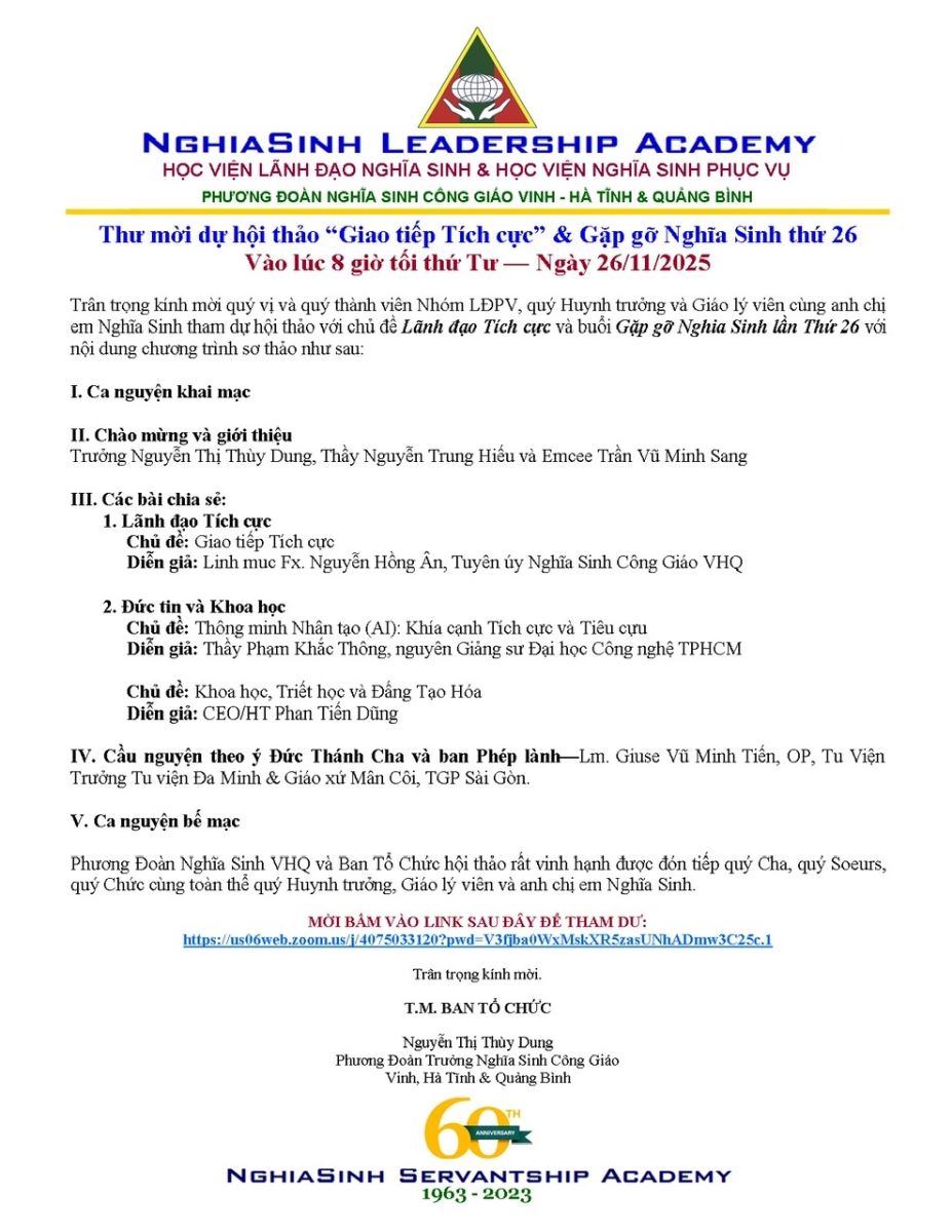 Thư mời dự hội thảo “Giao tiếp Tích cực” & Gặp gỡ Nghĩa Sinh thứ 26 Vào lúc 8 giờ tối thứ Tư — Ngày 26/11/2025