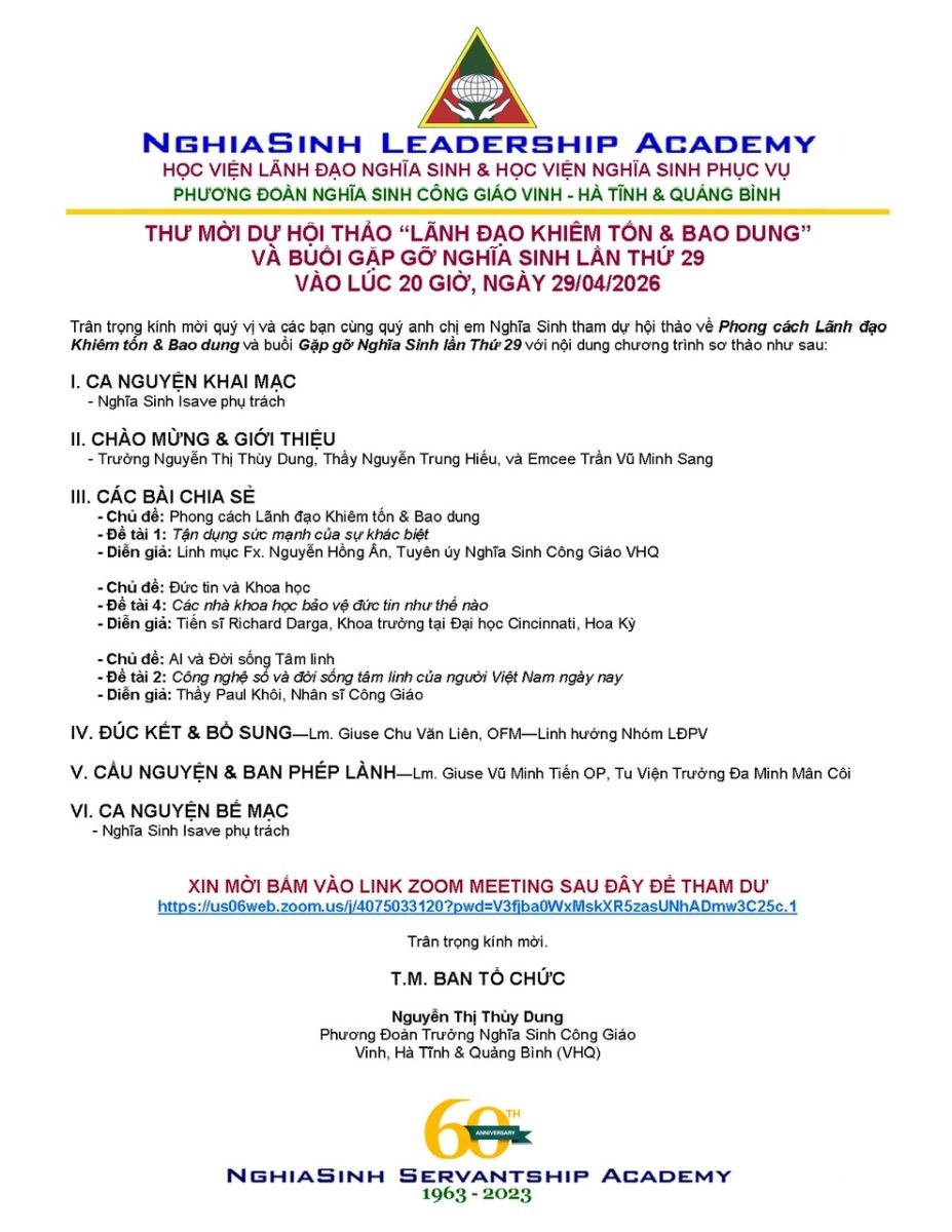 Trân trọng kính mời quý vị và các bạn cùng quý anh chị em Nghĩa Sinh tham dự hội thảo về Phong cách Lãnh đạo Khiêm tốn & Bao dung và buổi Gặp gỡ Nghĩa Sinh lần Thứ 29 với nội dung chương trình sơ thảo như sau:
