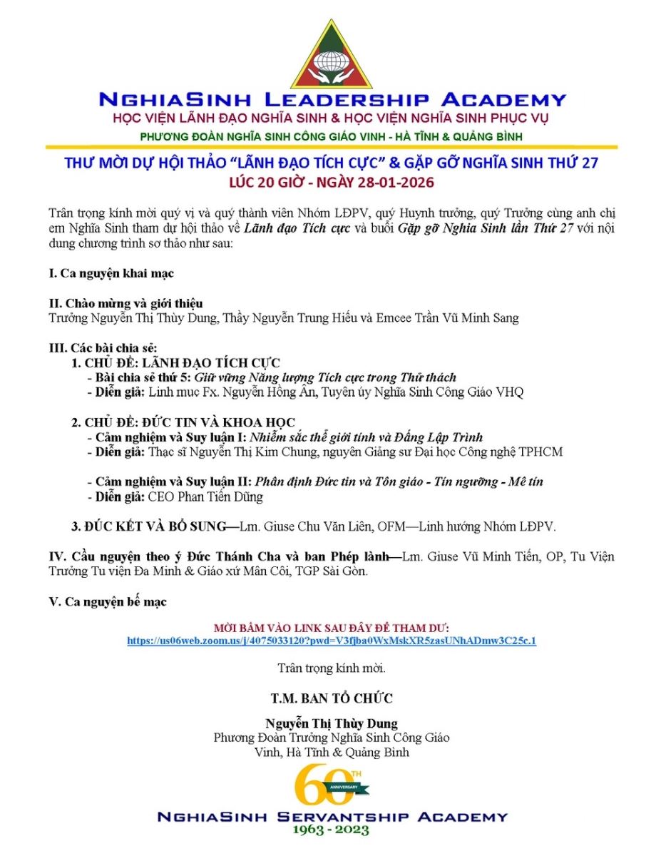 ✉ THƯ MỜI DỰ HỘI THẢO “LÃNH ĐẠO TÍCH CỰC” & GẶP GỠ NGHĨA SINH LẦN THỨ 27
